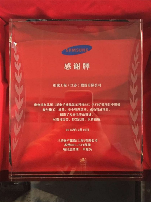 公司在蘇州三星項(xiàng)目施工中積極參與施工、質(zhì)量、安全管理活動(dòng),成功完成項(xiàng)目,創(chuàng)造了無(wú)安全事故現(xiàn)場(chǎng),三星物產(chǎn)建設(shè)(上海)有限公司特頒發(fā)“感謝牌”以示表彰。